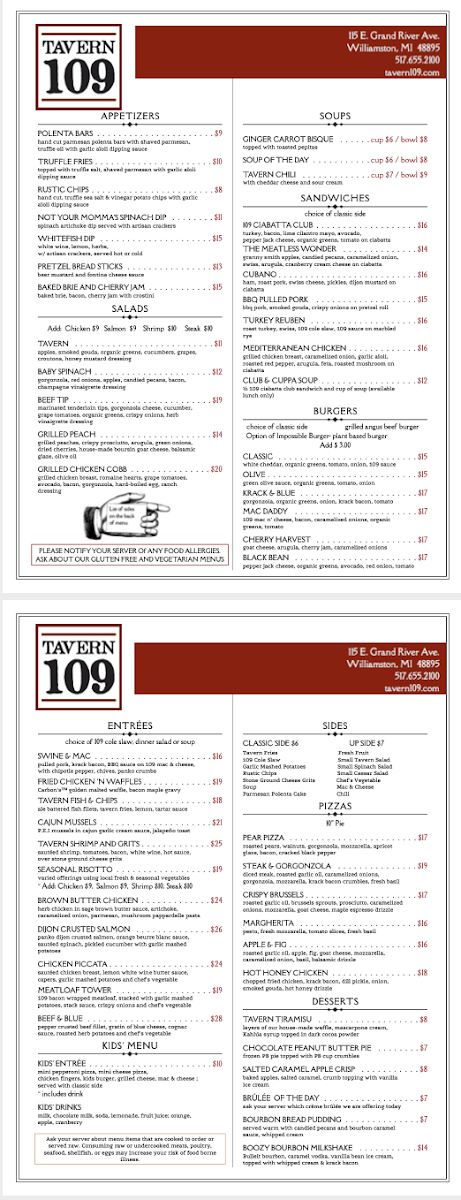 Welcome to Tavern 109, a gem located at 109 E Grand River Ave, Williamston, MI. Renowned for its vibrant atmosphere and exceptional service, this eatery offers a robust menu that caters to all tastes. Whether you crave comfort food or innovative dishes, Tavern 109 has you covered.